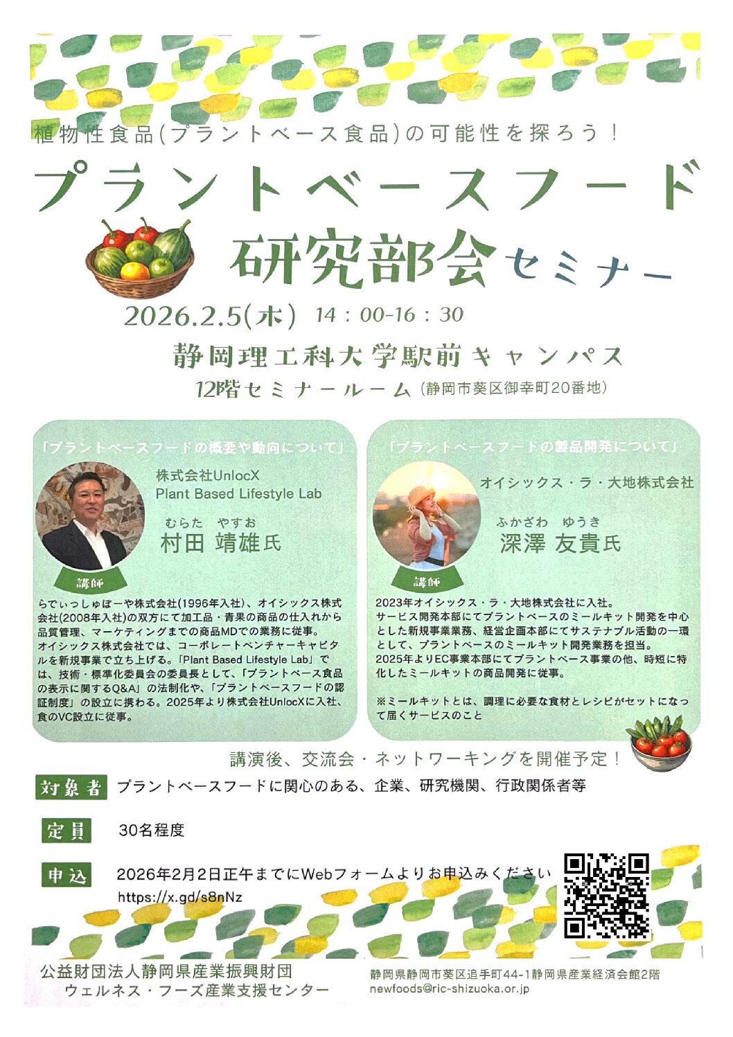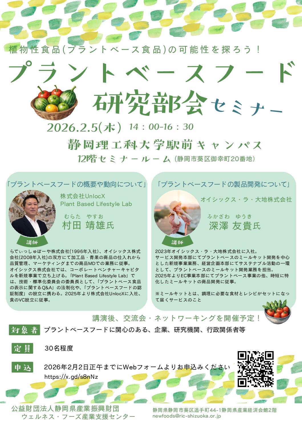 植物性食品(プラントベース食品)の可能性を探り、企業連携や多様な関係者の交流機会とするため、プラントベースフード研究部会セミナ...